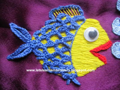 Work buttonhole knots on the fin with 2 strands (please refer frilled buttonhole stitch). The buttonhole knots on the scales were also done with 2 strands of thread. A googly eye completed the fish, and buttonhole wheels for the bubbles coming out of the fish’s mouth.